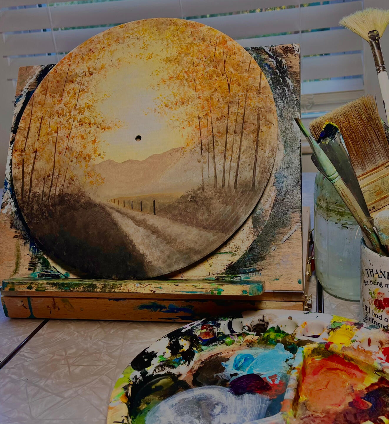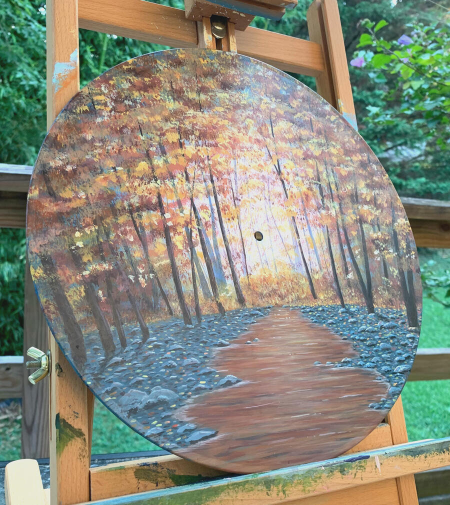 This art piece encapsulates the vibrant beauty of autumn in the Great Smoky Mountains. It was created on a 10 inch vinyl record using acrylic paint. Whether hiking or simply driving through, the Appalachian Mountains is known for its distinctly beautiful fall leaves and rocky river terrain. Let this piece immerse you in the roaring sound of the national park rivers, and bring a piece of the forest's beauty home with you.