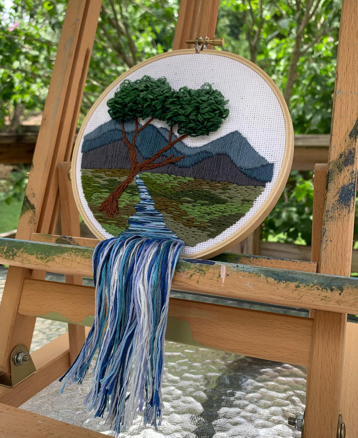This artwork was made by me personally on a 6 inch bamboo hoop using a variety of over 20 different colors of thread.This piece is one of my favorites in regards to showcasing fluidity using textural artwork. The stream is the main focus of the piece, I chose to accentuate the movement of water by making the thread cascade off the canvas. Other unique features of this piece include the texture of the tree bark and the accentuated loops used to portray leaves.You can either purchase the original artwork pictured, or you can have a replica commissioned for a discounted price.