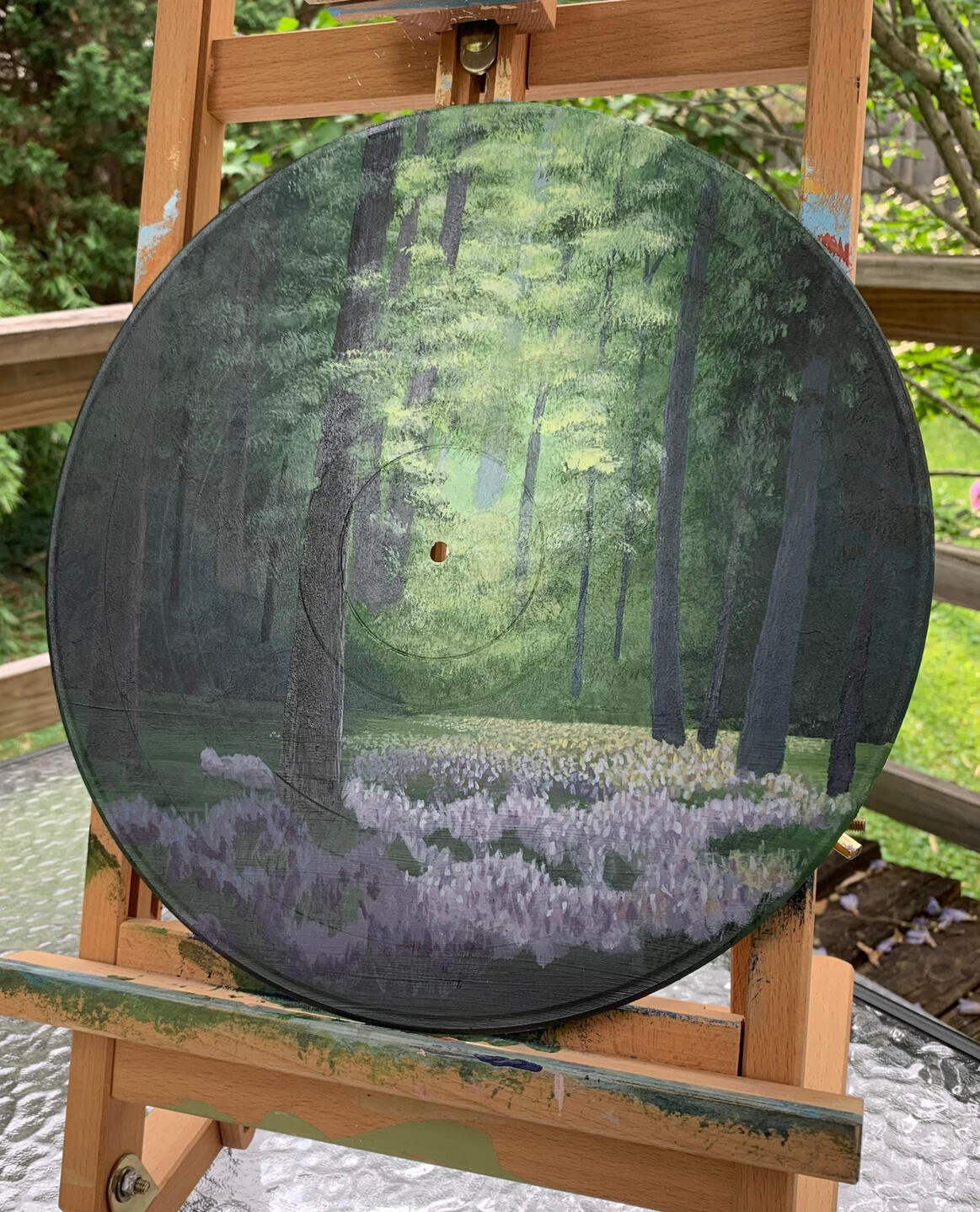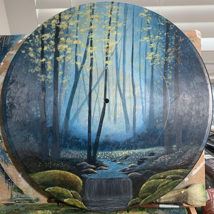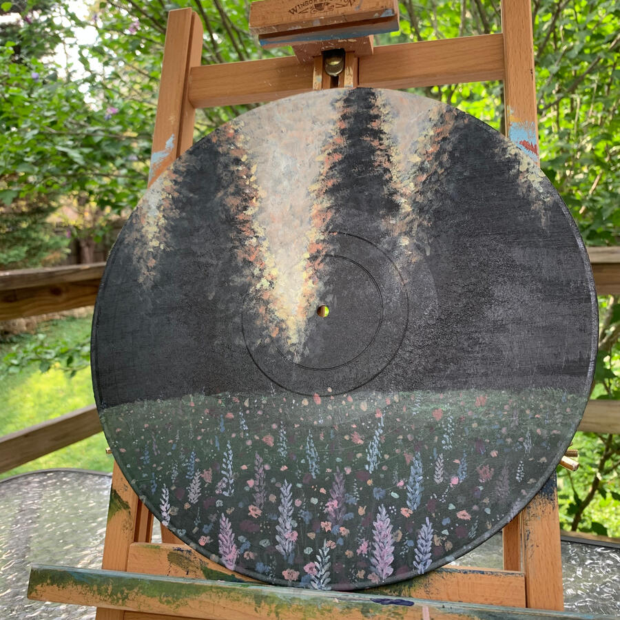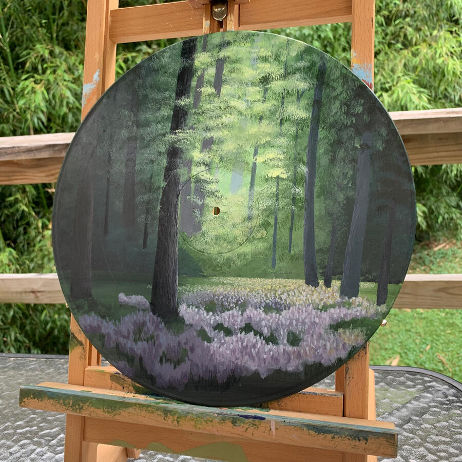 This acrylic painting was done by me personally on a 10 inch vinyl record.This piece perfectly encapsulates the serene calmness that comes from deep within the forest. I really enjoyed playing with the light and how it radiates through the foliage and against the trees. The purple flowers cascading the ground are a pleasant contrast to the yellow and green hues throughout the rest of the painting.This piece can be commissioned with any changes including different flowers or season (fall, winter).