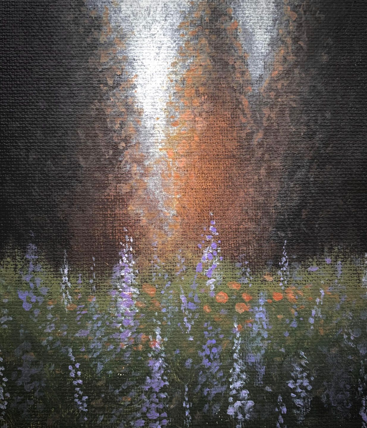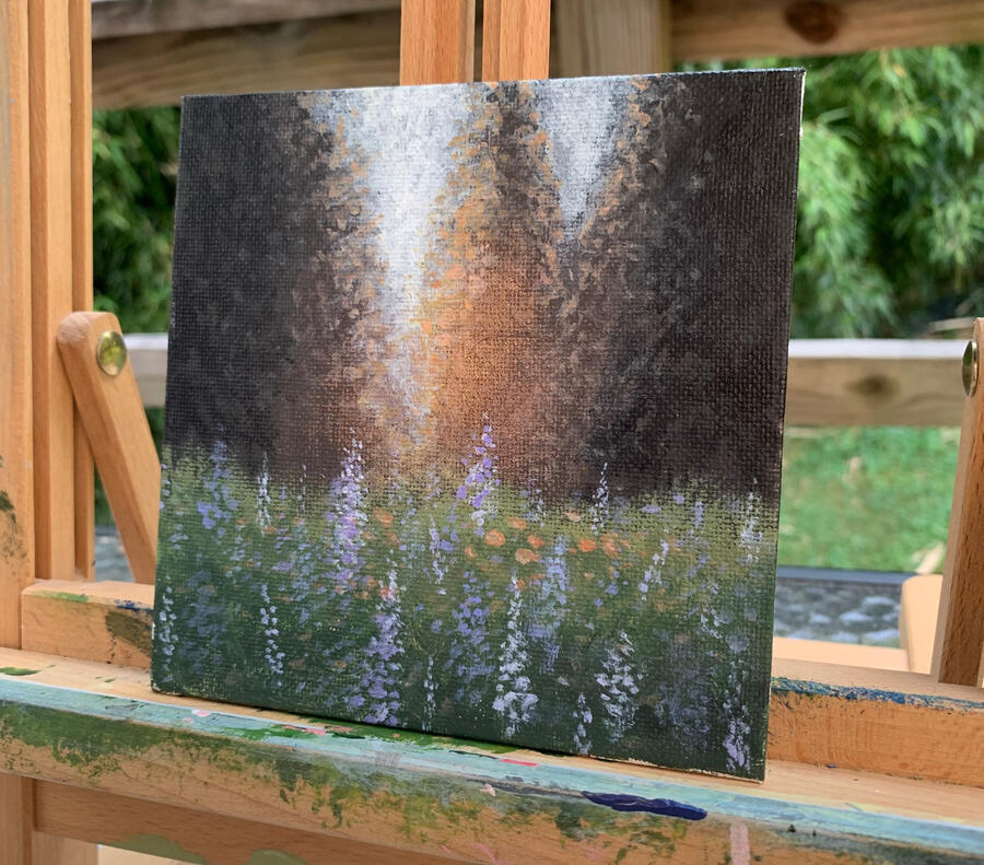 The goal of this piece was to encapsulate a whimsical and romantic environment. This dreamy setting perfectly captures the beauty of spring. The dark, full clouds in the horizon add a nice contrast to the pastel sunrise in the background. As the flowers come closer, they begin to develop a texture due to the thickening of acrylic paint. You can not only see but feel the individual flowers in the front.