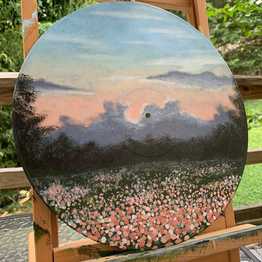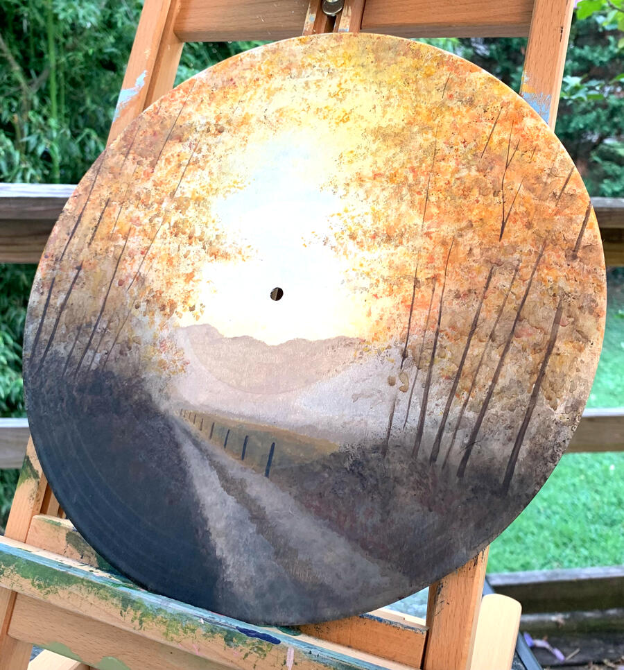 This artwork was done by me personally using acrylic paint on a 10 inch vinyl record.This painting is based off of a picture I took of the Blue Ridge Mountains in Fall of 2023. The warm glow of the sky is a nice contrast against the dark mountains. This painting perfectly encapsulates Appalachia at the cusp of autumn. A timeless piece that reminds me of home in the mountains.
