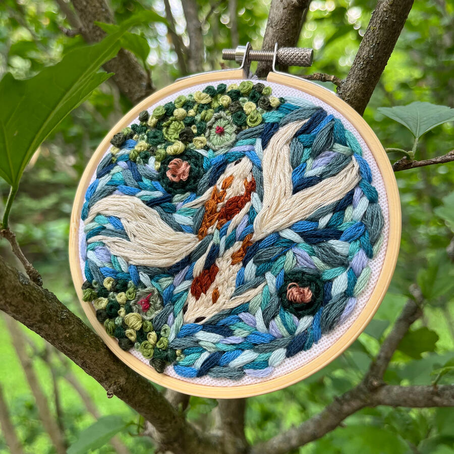 This artwork was done by me personally on a 4 inch bamboo hoop using a variety of over thirty different thread colors.The focus of this piece is fluidity and movement. I tried to capture the subtle beauty of the motion of the butterfly koi fish, known for their distinctly long tail, as they wade through the water. I included algae along the edge of the piece to show alternating texture.This is a piece that can be enjoyed not only through sight but by feeling the collection of textures the piece has to offer also. I employed various stitches to introduce diversity, echoing the intricate patterns found in nature.