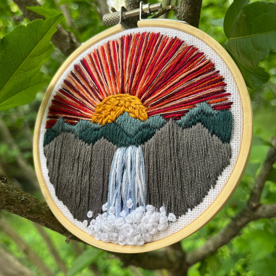 This artwork was made by me personally on a 4 inch bamboo hoop using a variety of over 20 different colors of thread.This piece holds a lot of significance in regards to my mindset at the time. The title represents a hopeful tomorrow. The cool toned mountain ridges are contrasted and placed into the background by the bright rays of the sun, which engulf a majority of the piece. I added an additional waterfall to accent the various textures I am capable of producing.