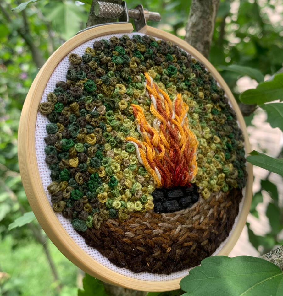 This artwork was done by me personally on a 4 inch bamboo hoop using a variety of over 20 different thread colors.The focus of this piece is fluidity and movement. I tried to capture the subtle beauty of the flames coming from the fire, almost as if it is coming out of the canvas. This elevation of threads that can be seen is from continuous thread layering and buildup, then using a unique loose stitch pattern to imitate the pattern of flames. Towards the edge of the canvas I slowly introduced darker threads to give the immersion of illumination. "Lux in tenebris lucet" means "the light shines in the darkness," and holds a great meaning for me, along with this art piece and my mindset at the time of creation.This is a piece that can be enjoyed not only through sight but by feeling the collection of textures the piece has to offer also. I employed various stitches to introduce diversity, echoing the intricate patterns found in nature.